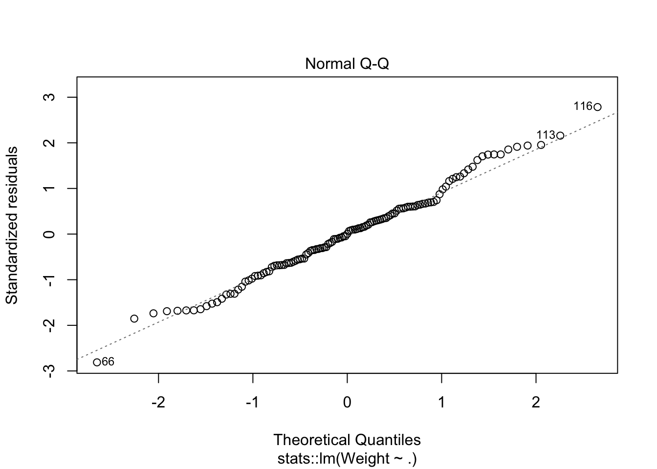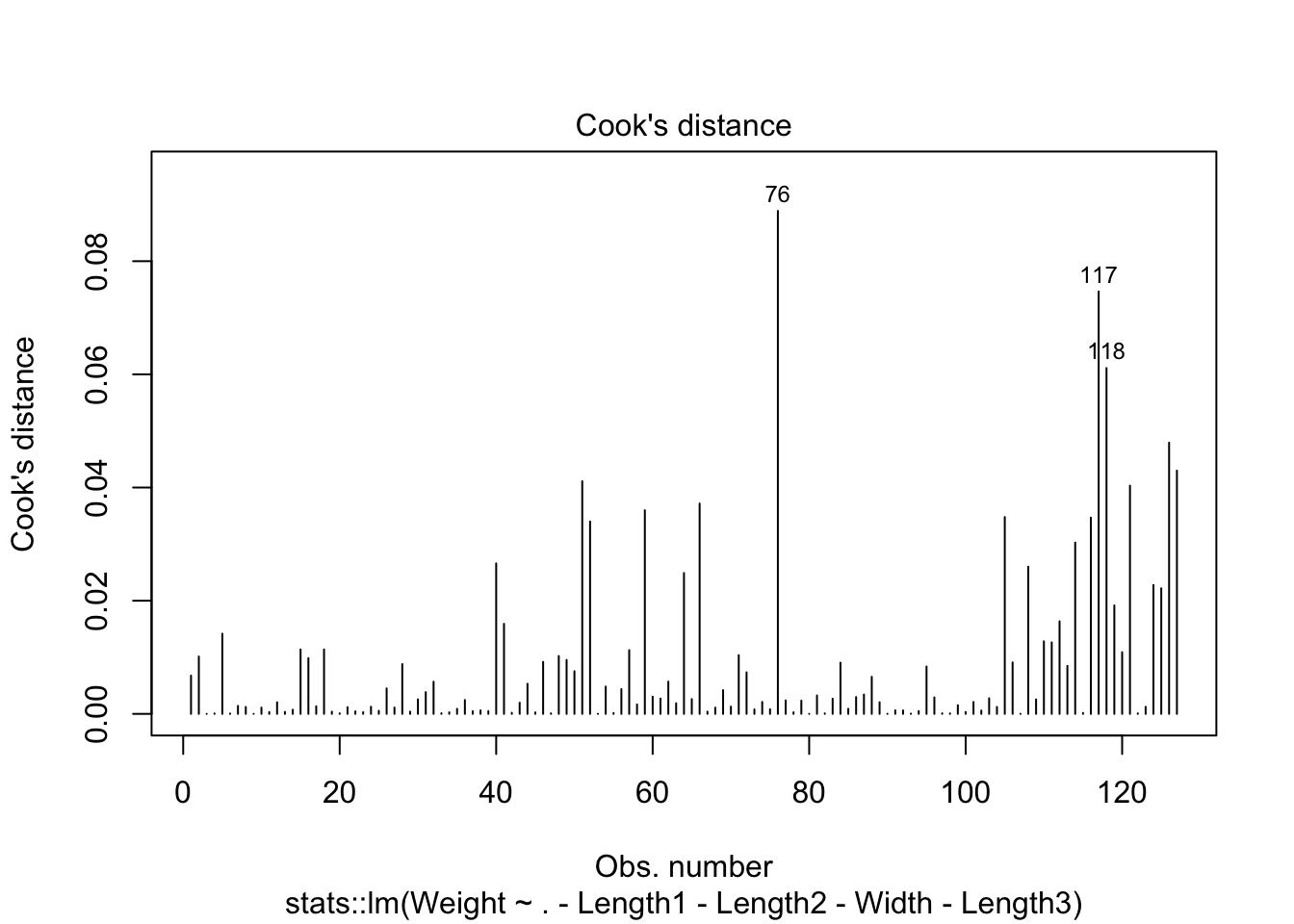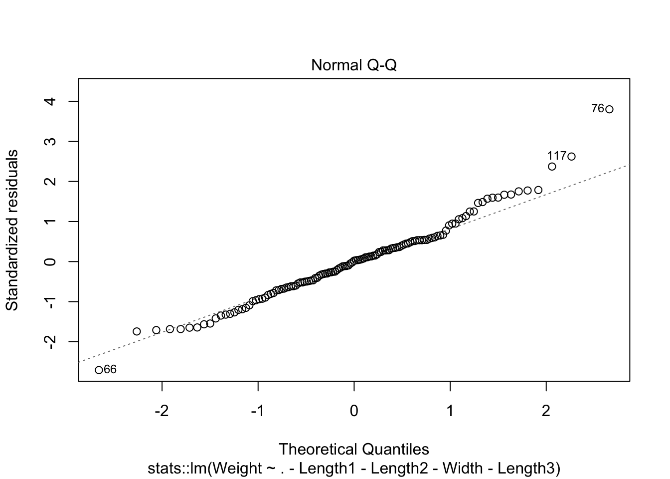 ## stats::lm(formula = Weight ~ . - Length1 - Length2 - Width -