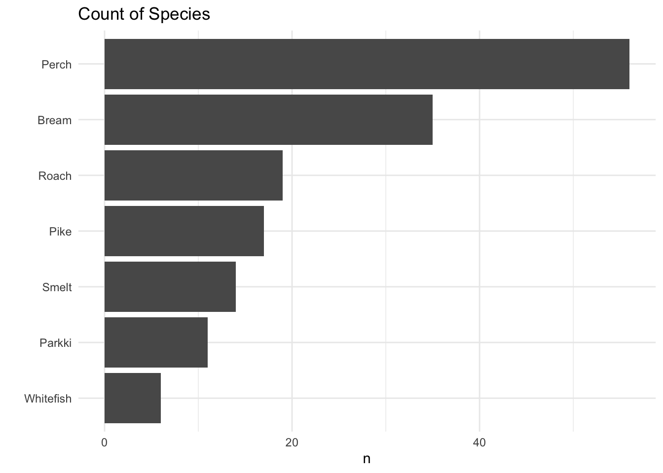 ## $ Species <chr> "Bream", "Bream", "Bream", "Bream", "Bream", "Bream", "Bream"…